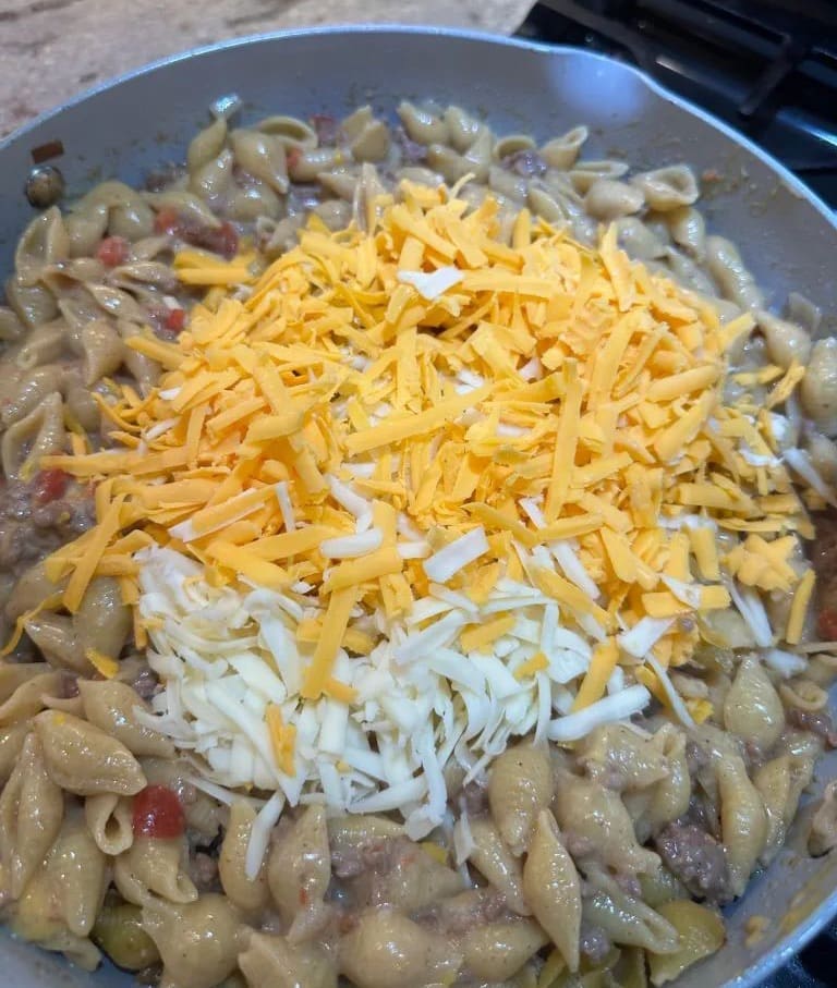- Stir in the shredded cheeses until they are evenly combined into the pasta also.