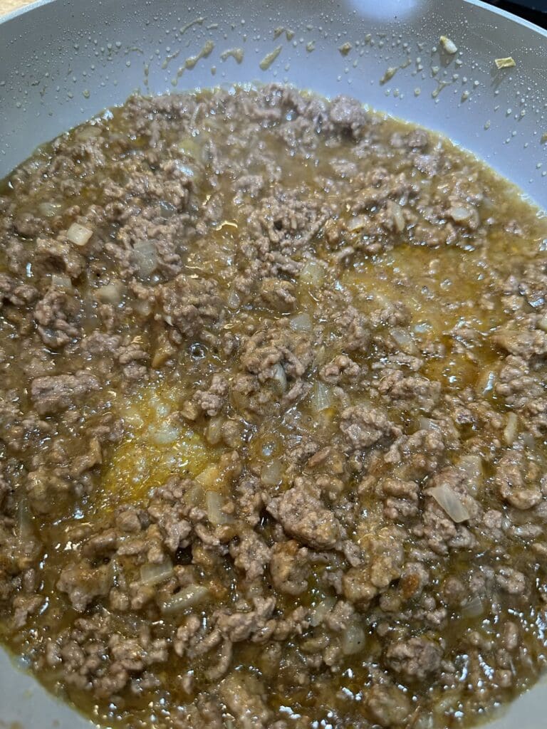 First, in a large lipped skillet, sauté the onion in a little oil for about 2 minutes then add the ground beef. Using a wooden spoon, break the beef down into small pieces as it browns.