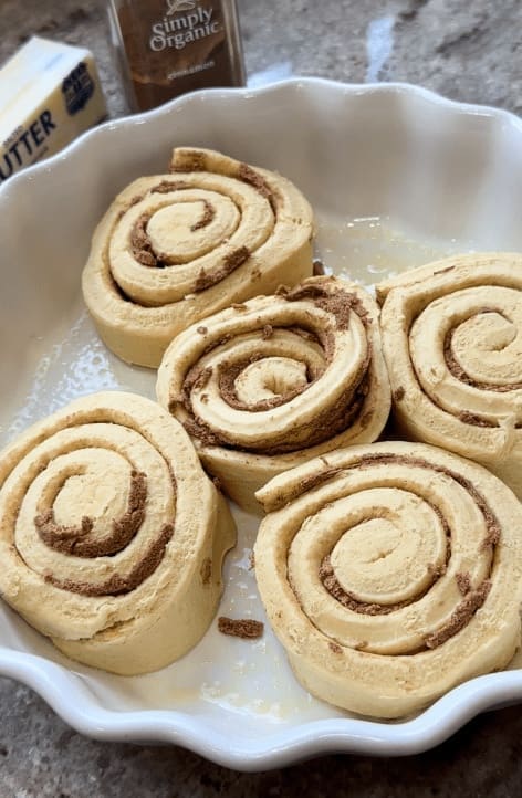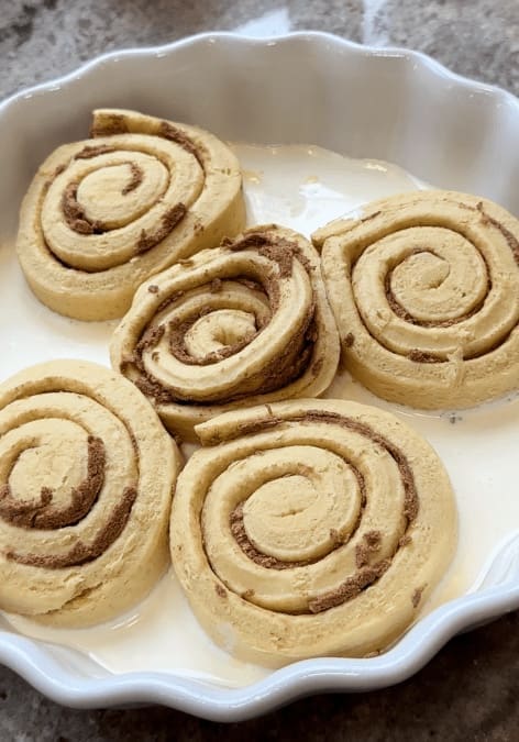 - First, spray a baking dish with cooking spray and place the cinnamon rolls down leaving some space in between them to expand. Keep the icing the cinnamon rolls come with on the side for now.