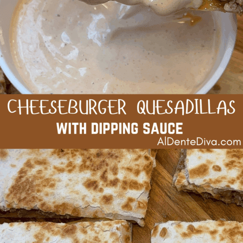 Cheeseburger quesadillas with dipping sauce are made with seasoned ground beef and melted American cheese tucked between toasted tortillas and served with a delicious homemade dipping sauce.