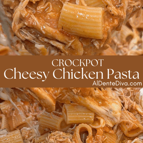 Crockpot Cheesy Chicken Pasta features tender chicken slow-cooked in a creamy blend of marinara and Alfredo sauce, then shredded, tossed with pasta, and topped with melted mozzarella cheese.